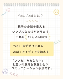 親子関係をより豊かにするコミュニケーションとして、「Yes, And」というアプローチを取り上げます。