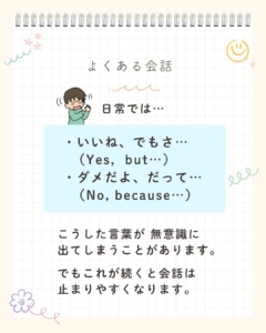 相手の提案や発言に対して、「No」や「But」で否定するのではなく、まず「Yes」と受け入れます。